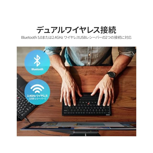 トラックポイント搭載。Bluetooth 5.0または2.4GHz ワイヤレスUSBレシーバーの2つの接続に対応したワイヤレスキーボード。