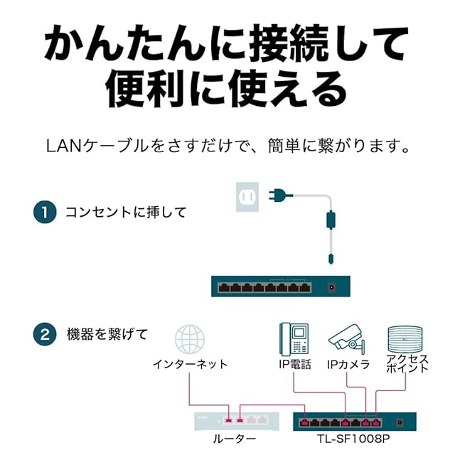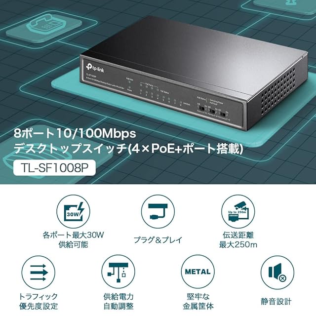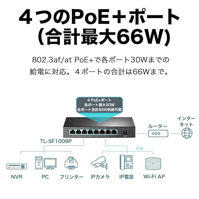 TP-Link スイッチングハブ 8ポート 10/100Mbps PoE+対応ポートx4 各ポート30W(合計66Wまで)まで【エクステンドモード: 250Mまで接続可】TL-SF1008P