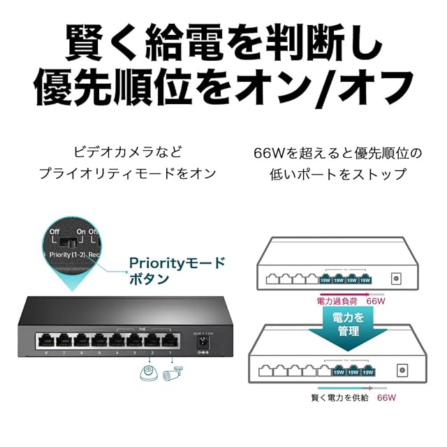 【賢く給電】総電力消費量が67Wを超えると、賢い電源管理機能が優先度の低いポートの電源をオフにして優先度の高いポートの電源を確保し、デバイスを電力過負荷運転から保護。さらに、デバイスに必要なPoE電力を自動的に検出し、PoE非対応機器の損傷を防ぎます。