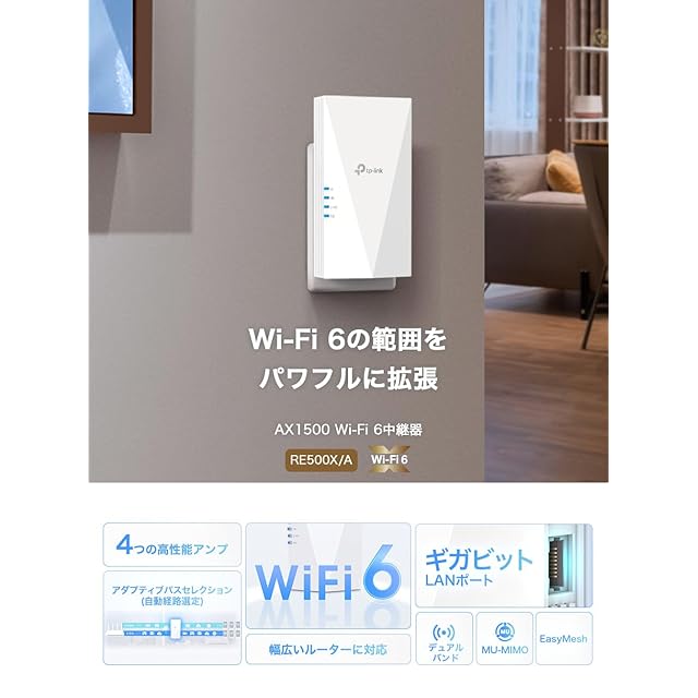TP-Link Wi-Fi 無線LAN 中継器 wifi中継機 Wi-Fi6 対応 1201 + 300Mbps 11ax APモード メッシュWiFi :EasyMesh対応 ギガ有線LANポート RE500X/A