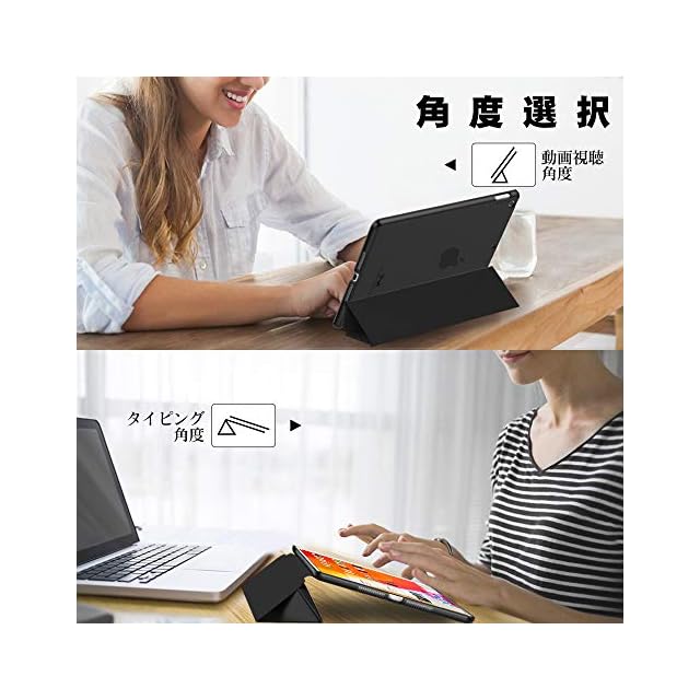 [三つ折りスタンド]: 表面カバーは二つの溝デザインされて、溝を折るとスタンドになれます。二つの置く角度によって両手解放で動画鑑賞を楽々に楽しめ、またはタイピング角度にも変えて、仕事やゲームなどもっと快適に進められます。