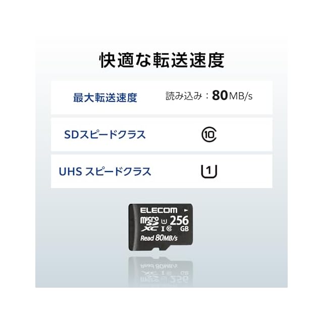高速インターフェース規格であるUHS-I/UHSスピードクラスの「Class1」、および読み書き時の最低速度をするSDスピードクラスの「Class10」に対応したmicroSDカードです。