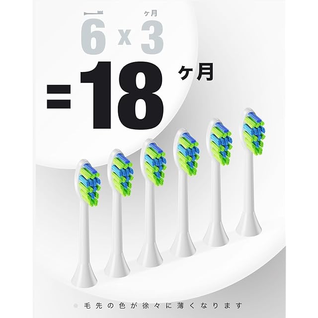 【6つの替えブラシ、「W」デザイン】替えるブラシヘッドを6個付属しているので、頻繁に交換用の電動はぶらしヘッドを注文する必要がありません。 毛先にはDUPONTナイロンを採用し、歯の形に合わせた「W」デザインで、歯ぐきや届きにくい部分を徹底的にクリーニングします。 注意:口腔内をやさしく扱っていただきます。 青いブラシ毛先の色が薄くなったら、ブラシヘッドを交換してください。 1つのブラシヘッドで3ヶ月間使用できて、6つのは約18ヶ月間使用できます。