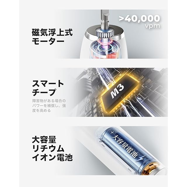 【強力な音波洗浄と1年】最新型の電動歯ブラシである。歯肉線に沿って音波振動技術で効果的に洗浄し、99%以上の歯垢を除去し、歯を白くなります。手磨きよりも2週間で口腔健康の状況がアップされます。[ 一年 ] 万が一、取扱説明書に従った使用で不具合があった場合には、いつでもご連絡ください。弊店はご満足なカスタマー サービスを提供いたします。