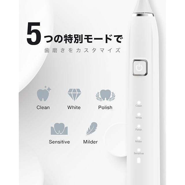 【5つの高性能の電動歯磨きモード】cleanクリーン(やさしい)、whiteホワイト(強い)、polishポリッシュ(強い反転周波数)、milderマイルド(やさしい反転周波数)、sensitiveセンシティブ(ソフト)。各種類の歯や歯ぐきの状態にちゃんと合わせます。お好みや歯科医の勧めに合わせて最適な歯磨きモードを選択することができます。