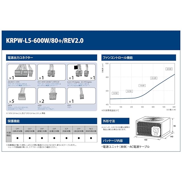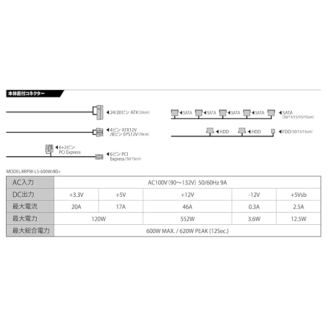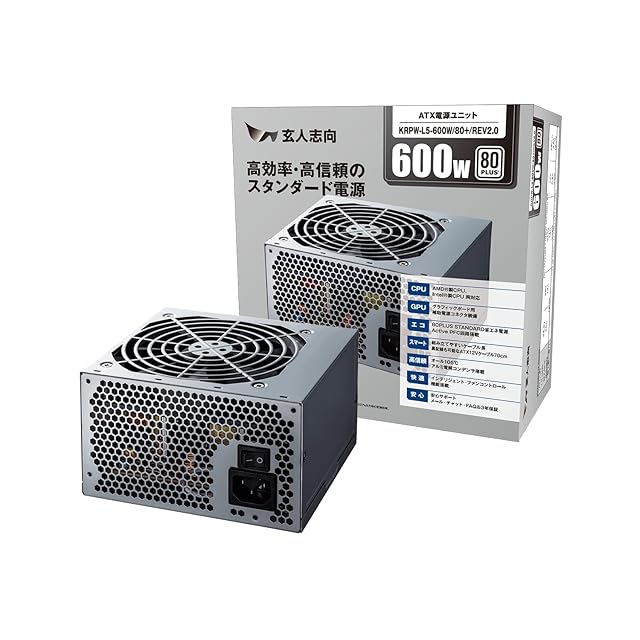 玄人志向 電源ユニット 600W ATX 電源 80 PLUS スタンダード PC電源 12cm静音ファン KRPW-L5-600W/80+/REV2.0