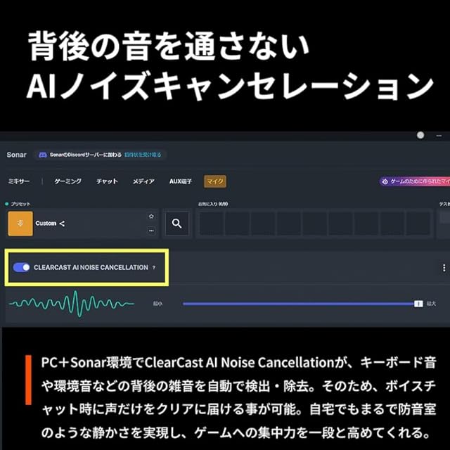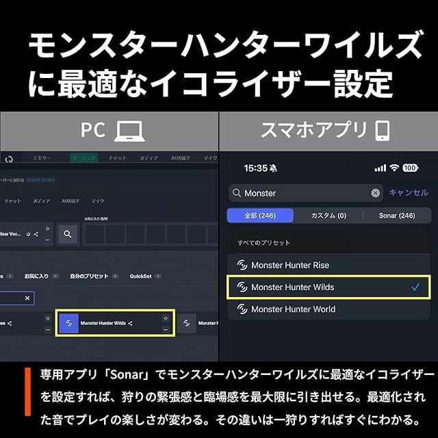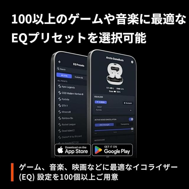 100以上のゲームや音楽に最適なEQプリセットを選択可能:ゲーム、音楽、映画などに最適なイコライザー (EQ) 設定を100個以上ご用意。あらゆるコンテンツをベストな環境で楽しめる。