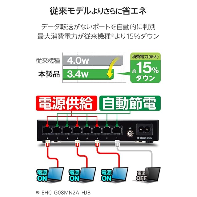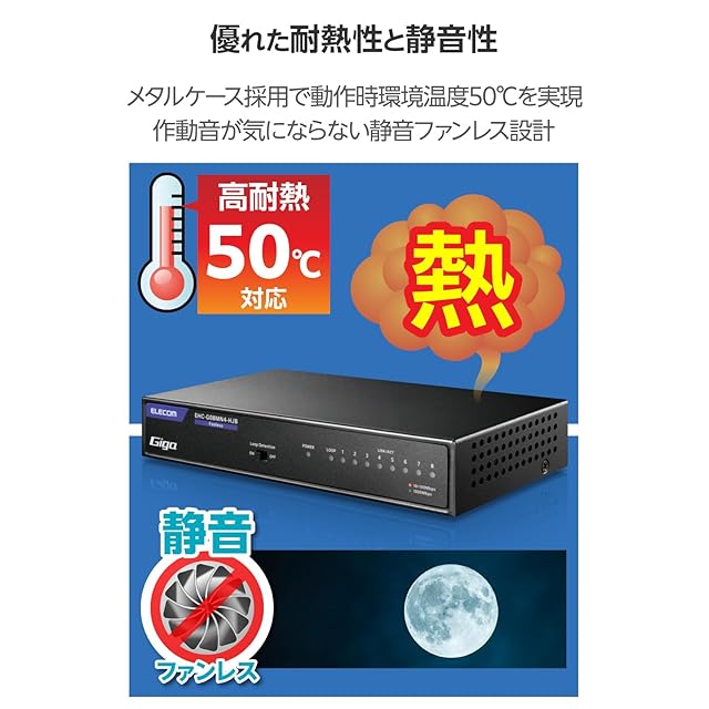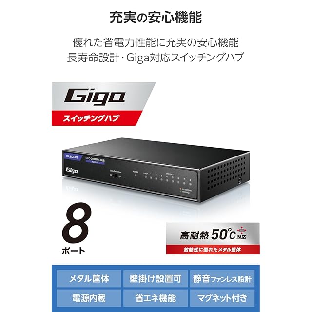 最大消費電力が従来機種(※)より15%ダウンの省エネモデル。ファンレスで耐熱50℃に対応し、ループ検知機能も搭載したGiga対応、電源内蔵のメタル筐体8ポートハブです。 ※従来機種:EHC-G08MN2A-HJB
