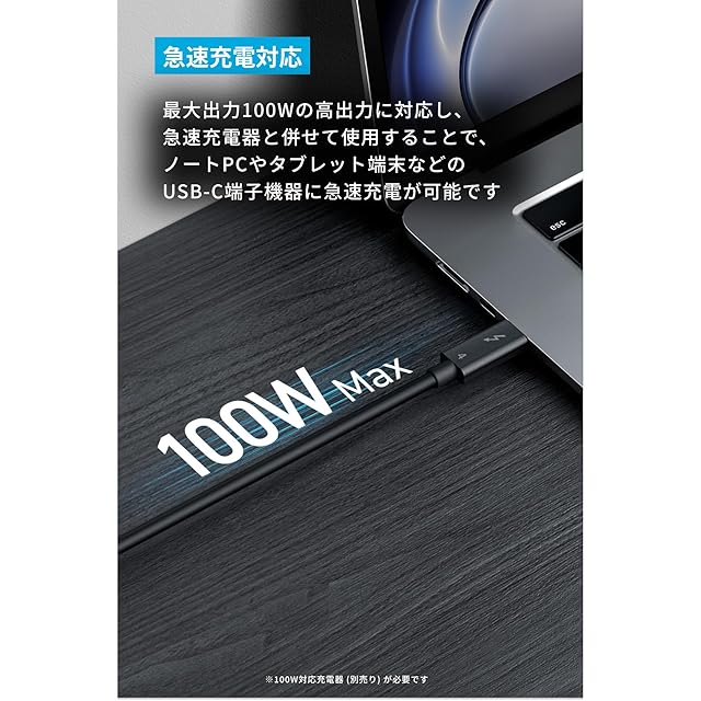 急速充電対応: 最大出力100Wの高出力に対応し、急速充電器と併せて使用することで、ノートPCやタブレット端末などのUSB-C端子機器に急速充電が可能です。