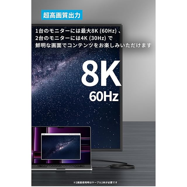 超高画質出力:1台のモニターには最大8K (60Hz) 、2台のモニターには4K (30Hz) の超高画質出力に対応し、鮮明な画面でコンテンツをお楽しみいただけます。
