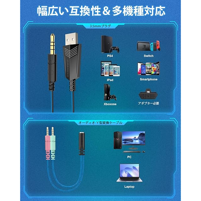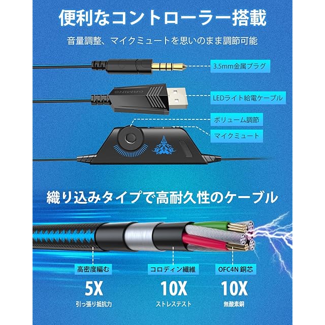 【耐久性と便利性】ワイヤーには10芯OFC無酸素銅線材の耐久性と 強度に優れた伸縮性ケーブルを採用しているため絡まりにくい設計と なっています。ヘッドバンド部分はABSとタングステン網で高い耐久 性を実現しました。調整コントローラーを手元に置けばスピーカーとマ イクの調整が即時に可能です。ご使用状況に合わせて自由自在に変化で きる商品となっております。【安心的な日本語サポート】一年間無料が提供しております。 日本語によるカスタマーサポートが対応しておりますので、万が一、破損や故障、付属品不足等がございましたら、お気軽にご連絡ください。必ず最善を尽くし、カスタマーサービスをご対応いたします。