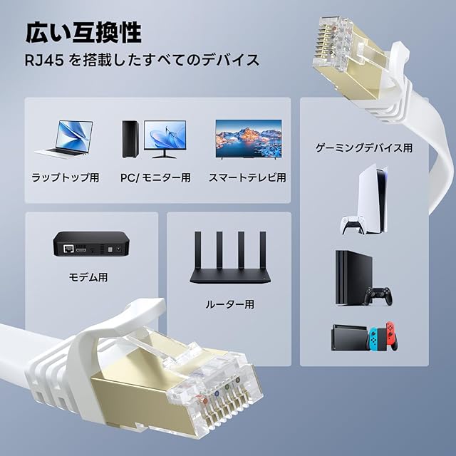 広範な互換性: 既存のCat6、Cat6a、Cat7 LANケーブルなどと互換性があります。両端にRJ 45インタフェースがあり、ルータ、スイッチ、スマートテレビ、パソコン、プリンター、ゲーム機などの設備に適している