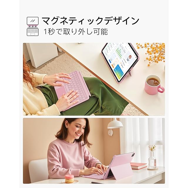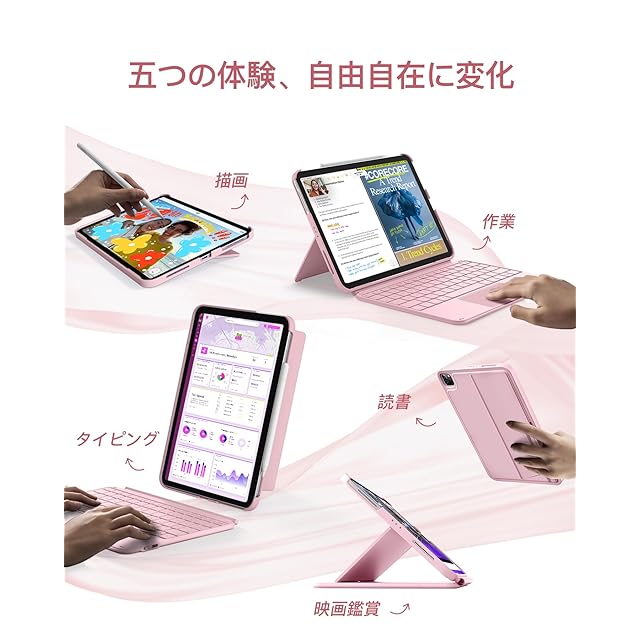 磁気取り外しデザイン:キーボードとiPad保護ケースは磁石で接続されており、わずか1秒で簡単に取り外し可能です。背面パネルは横向きと縦向きの両方をサポートし、仕事、学習、映画鑑賞、絵を描く、読書など、多角的なニーズに対応します