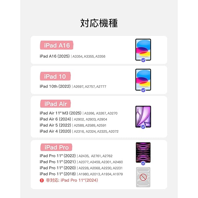 互換性:iPad A16 第11世代/第10世代、iPad Air 11インチ M3 2025/M2 2024、iPad Pro 11インチ第4/3/2/1世代、iPad Air 第5世代/第4世代(10.9インチ)向けに特別に設計されています。iPad Pro 11 第4世代 2022(A2435/A2759/A2761/A2762)、iPad Pro 11 第3世代 2021(A2301/A2377/A2459/A2460)、iPad Pro 11 第2世代 2020(A2228/A2068/A2230/A2231)、iPad Pro 11 第1世代 2018(A1980/A2013/A1934/A1979)と互換性があります