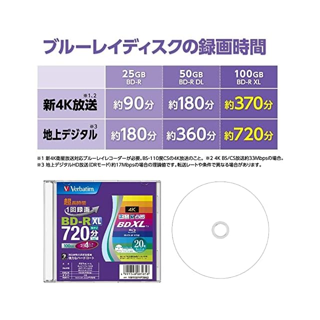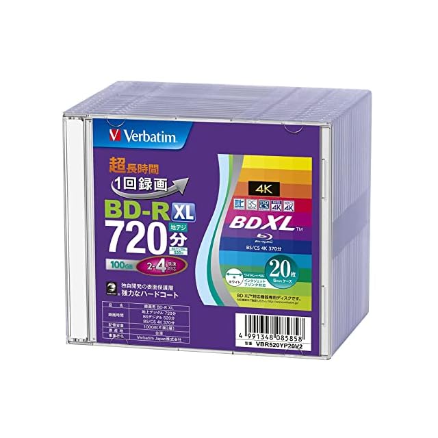 バーベイタム (Verbatim) 1回録画用 ブルーレイディスク BD-R XL 100GB 20枚 5mmプラケース ホワイトプリンタブル 片面3層 2-4倍速 VBR520YP20V2