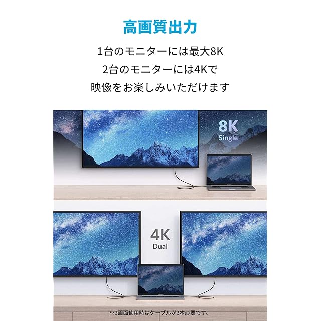 高画質出力:1台のモニターには最大8K、2台のモニターには4Kで映像をお楽しみいただけます。