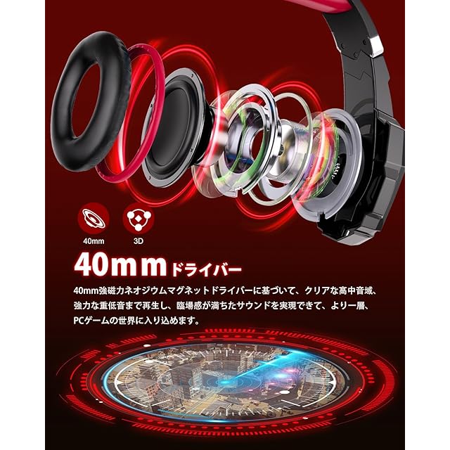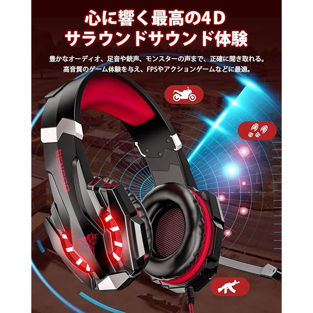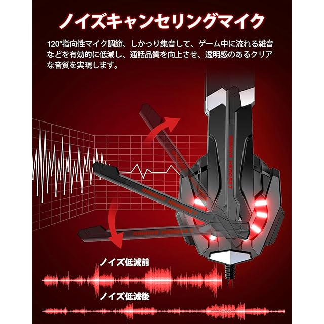 【大迫力なサラウンドサウンド】専門的なゲーミングヘッドセットメー カーにより作られた本製品の品質をぜひお楽しみ下さい。高精度強磁力ネオジウムドライバーに基づいて、クリアな低 域音質から高域音質まで再生し、また、3Dサラウンドサウンドによって、音の立体感を高め、震撼な衝撃音を高精度で再現可能にしました。本製品であればゲーム中のモンスターや敵の足音、銃声、爆発 音などを聞き逃すことはもうありません。
