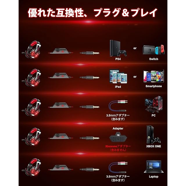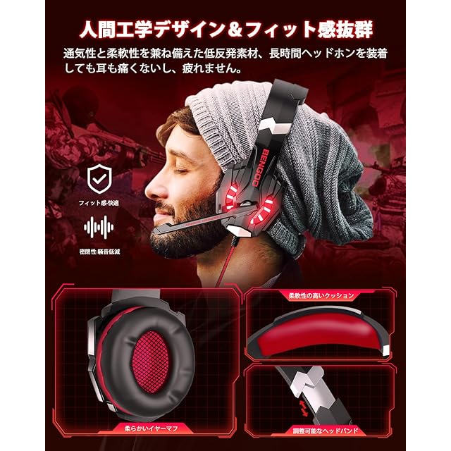 【優れた互換性】「アメリカで人気を誇るBENGOOヘッドセット!未 体験の方もぜひお試しください!」セットアップが簡単なため、購入 後すぐにゲームや音楽鑑賞、チャット等にお使い頂けます。ノートパソ コンの他、PC、PS5/4、Xbox One、switch、スマホ等でも使用できます。ご注意:3.5mm Y型アダプターは別売りです。旧型Xbox Oneに接続する場合は別途Microsoft Adapterが必要となります。