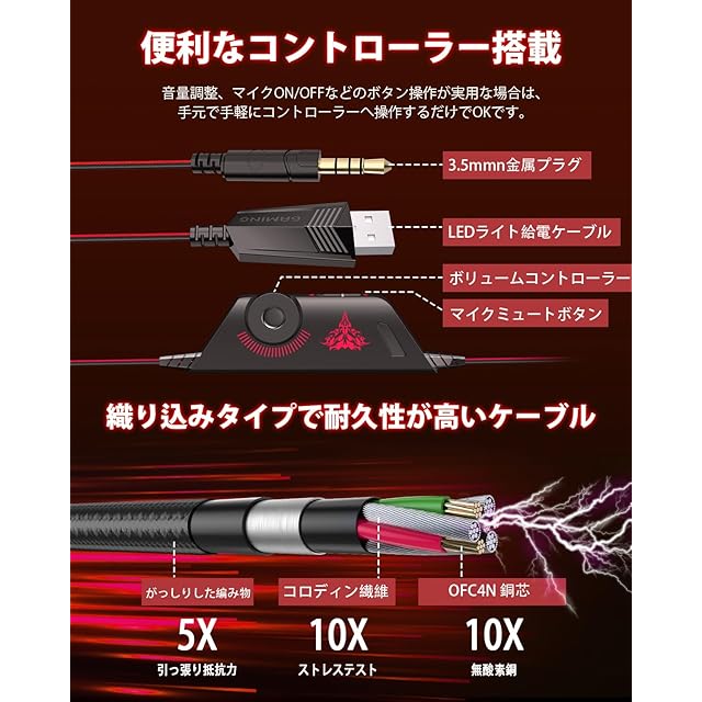 【耐久性と便利性】ワイヤーには10芯OFC無酸素銅線材の耐久性と 強度に優れた伸縮性ケーブルを採用しているため絡まりにくい設計と なっています。ヘッドバンド部分はABSとタングステン網で高い耐久 性を実現しました。調整コントローラーを手元に置けばスピーカーとマ イクの調整が即時に可能です。ご使用状況に合わせて自由自在に変化で きる商品となっております。【安心的な日本語サポート】一年間無料が提供しております。 日本語によるカスタマーサポートが対応しておりますので、万が一、破損や故障、付属品不足等がございましたら、お気軽にご連絡ください。必ず最善を尽くし、カスタマーサービスをご対応いたします。