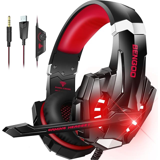 BENGOO ゲーミングヘッドセット PS5 ヘッドセット ノイズキャンセリング マイク付き 3.5mm有線 ゲーミングヘッドホン スイッチ ヘッドフォン 軽量 全効能 重低音 LEDライト コントローラー ミュート付き ステレオ FPS ゲーム用 Nintendo Switch Xbox One PS4 スマホ PC対応 (赤)