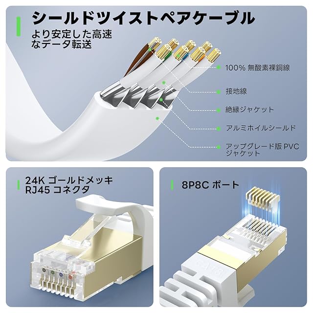 広範な互換性: 既存のCat6、Cat6a、Cat7 LANケーブルなどと互換性があります。両端にRJ 45インタフェースがあり、ルータ、スイッチ、スマートテレビ、パソコン、プリンター、ゲーム機などの設備に適している