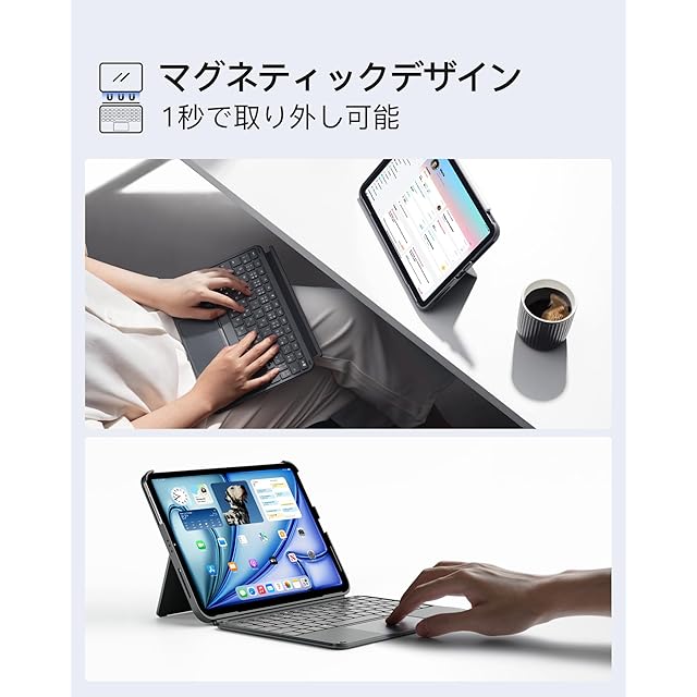 1秒磁石脱着:ipad キーボード付きケースは磁石接続で1秒で簡単に着脱可能。仕事ではキーボードを装着すると「ノートPC」のように変身し、キーボードと画面の角度がよりフィットします;昼休みの動画視聴や会議でのプレゼン時は瞬時に薄型ケースに変身。背面スタンドは横置きでの動画鑑賞から縦置きでの文書閲覧まで、1つのアクセサリーですべてのシーンに対応