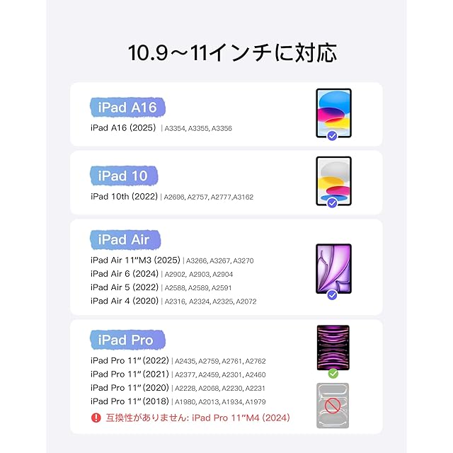 互換性:iPad A16 第11世代/第10世代、iPad Air 11インチ M3 2025/M2 2024、iPad Pro 11インチ第4/3/2/1世代、iPad Air 第5世代/第4世代(10.9インチ)向けに特別に設計されています。iPad Pro 11 第4世代 2022(A2435/A2759/A2761/A2762)、iPad Pro 11 第3世代 2021(A2301/A2377/A2459/A2460)、iPad Pro 11 第2世代 2020(A2228/A2068/A2230/A2231)、iPad Pro 11 第1世代 2018(A1980/A2013/A1934/A1979)と互換性があります
