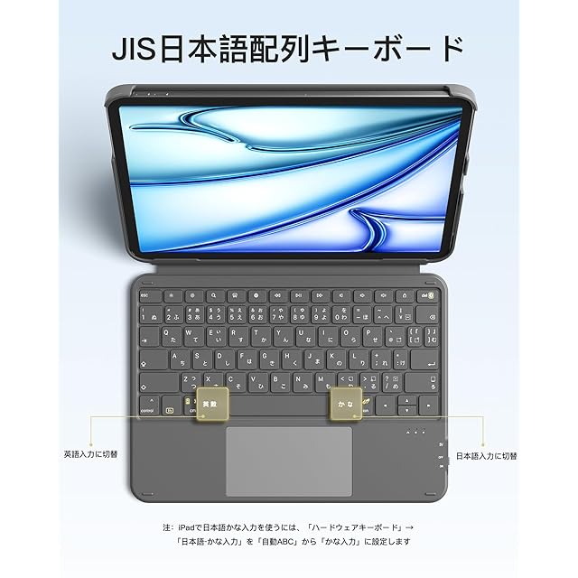 入力設定:シザースイッチ構造に1mm短キーストロークを採用し、打鍵フィーリングが軽快です。1時間連続でタイピングしても手首が疲れにくい仕様。Bluetoothキーボードを接続した後、かな入力法を使用する際のタイピング体験を向上させるために、ハードウェアキーボードの設定を調整してください。「日本語ーかな入力」を選択し、「自動ーABC」オプションを 「かな入力」に変更してください