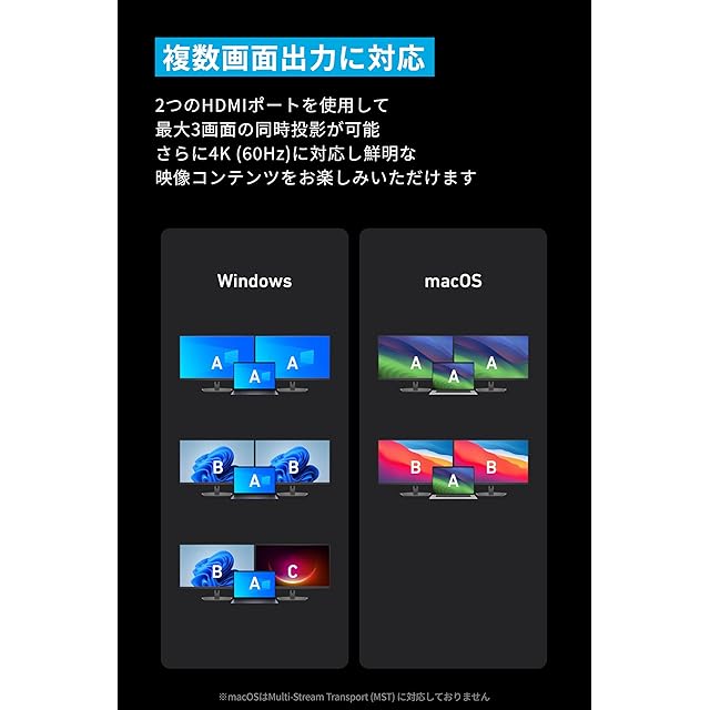 14の機能を1つに:データ転送用USB 3.1 Gen2 (10Gbps) 対応ポート3つなど14の機能をこれ1台で使用できます。また、4K (60Hz) 対応のHDMIポートを2つ搭載しているためデュアルディスプレイにも対応可能です。