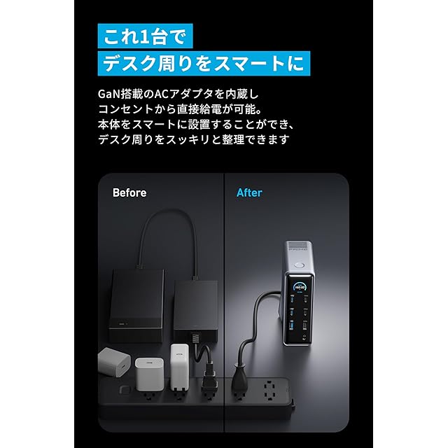 これ1台でデスク周りをスマートに: GaN搭載のACアダプタを内蔵しコンセントから直接給電が可能で、本体をスマートに設置することができ、デスク周りをスッキリと整理できます。