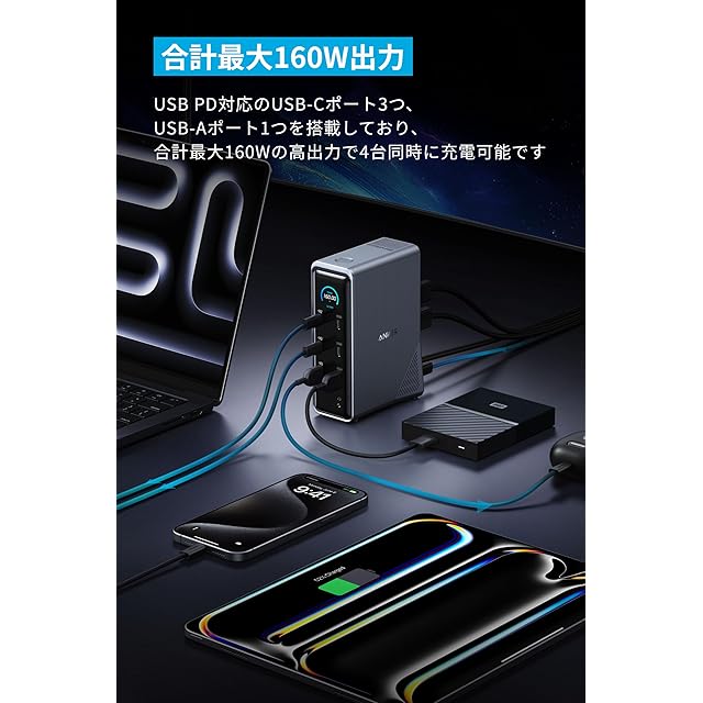 合計最大160W出力: USB PD対応のUSB-Cポート3つ、USB-Aポート1つを搭載しており、合計最大160Wの高出力で4台同時に充電可能です。