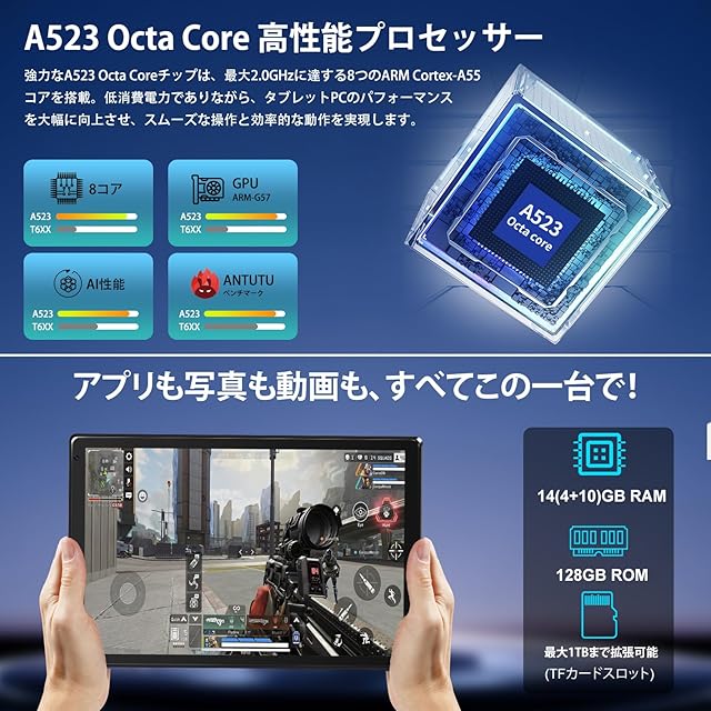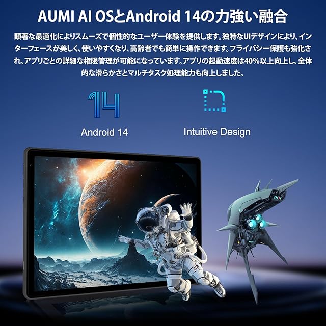 【14GB(4+10仮想)RAM・128GBROM・最大1TB拡張可能】タブレットは、AUMI AIOSがAndroid 14のアーキテクチャと統合され、システムの処理効率と安定性が大幅に向上。インターフェースデザインやバックグラウンド管理が最適化され、よりスマートでシンプルな使用感を提供します。リソース管理の精度がさらに高まり、プライバシー保護機能も強化。個人データの安全性を一層確実に守ります。強力な8コアプロセッサーにより、複数のタスク処理や高負荷のアプリケーション、HDビデオの再生がスムーズに行えます。メモリは、4GBの物理RAMと10GBの仮想メモリを含む合計14GBで、多くのタスクを並行して処理しても快適に動作します。ストレージは128GBで、最大1TBのTFカードによる拡張が可能。日常的な仕事、エンターテイメント、クリエイティブな作業において、速く滑らかな体験を提供します。