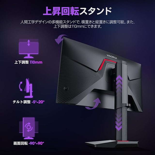 KOORUI ゲーミングモニター 24.5インチ FHD(1920x1080) 320Hz 1ms(GTG) Fast IPSパネル HDR400 sRGB 99%/DCI-P3 95%/Adaptive Sync/HDMI2.0×2/DP1.4/VESA対応 高さ調整 縦横回転 G2511E