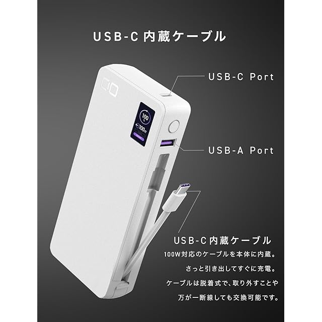 【100W出力対応ケーブル内蔵】サイズは約149.5×68.5×25.7mmで重量は約390gと、同じ出力レベルのモバイルバッテリーの中でも最小、最軽量級のコンパクトさを実現。さらに約70mmの100W出力対応ケーブルを本体側面に内蔵。CIOのケーブル内蔵モバイルバッテリーとして標準の交換可能な仕様を継承しているので、万一の断線時にも安心です。