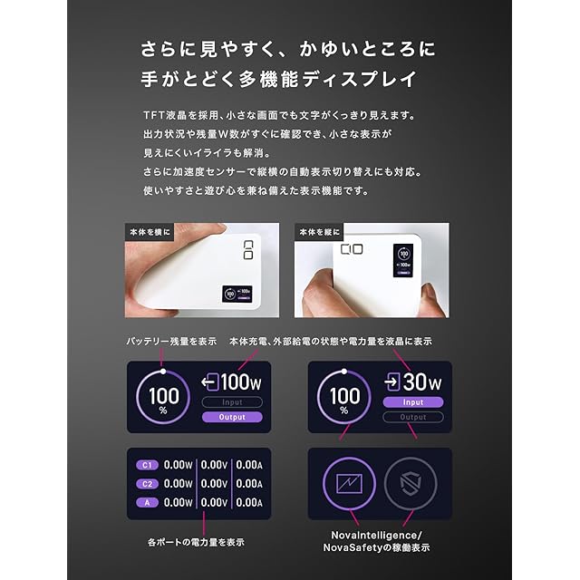 【充電器の動作状況がわかるスクリーン】1%単位の充電残量や各USBポートの出力状況をリアルタイムで確認できるスクリーンを搭載。「100W」「65W」といったデバイスの充電出力を見える化。さらにCIO独自技術NovaIntelligence(自動振り分け機能)やNovaSafety 2.0(安全保護機能)の動作状況も表示されます。側面の切り替えボタンでスクリーンのON/OFFや、表示内容の切り替えが可能。重力センサーを内蔵し、本体の向きに応じて表示の向きが変わります。※スクリーン部にはフィルムを貼っており傷が付いているように見えますが、フィルムをはがすと綺麗な液晶画面となります。
