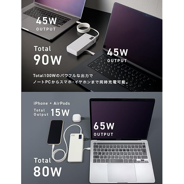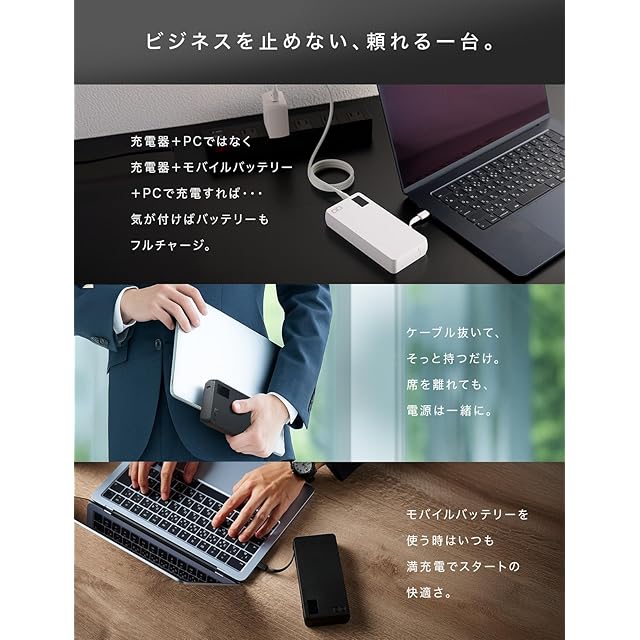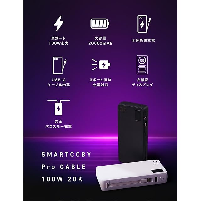 【ノートパソコンも充電できるモバイルバッテリー】SMARTCOBY Pro CABLEは単ポート最大100W、高出力でApple MacBook Pro 、パナソニック Let's note(レッツノート)といったハイエンドノートPCも充電可能なモバイルバッテリーです。大容量20000mAh搭載で、ノートPCを用いたミーティングを伴う出張など、充電環境に不安のあるビジネスシーンにおいておすすめです。