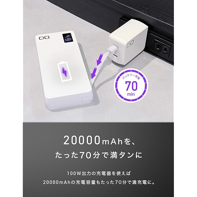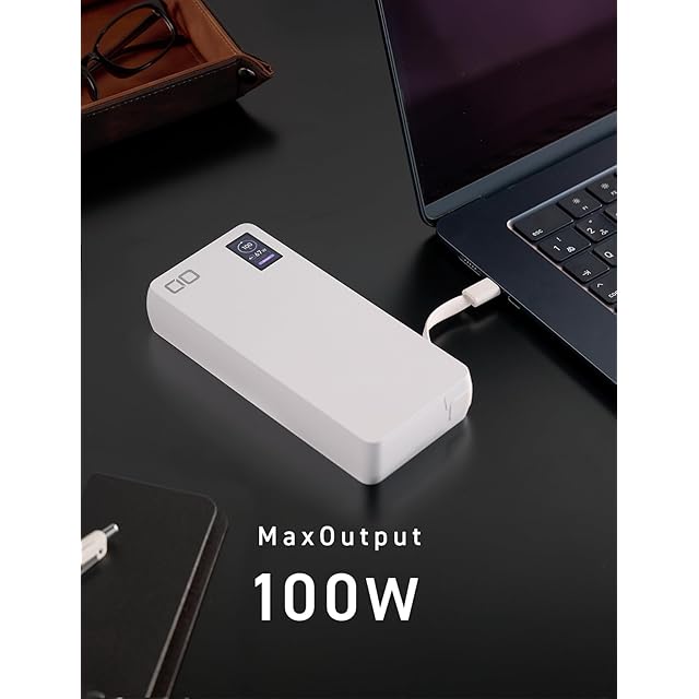 CIO モバイルバッテリー 100W ケーブル内蔵 大容量 20000mAh [脱着式ケーブル] PD 高出力 CIO独自技術 NovaIntelligence NovaSafety2.0搭載 ノートパソコン用モバイルバッテリー MacBook Pro iPhone 17 / 16 / 15 / Android SMARTCOBY Pro CABLE 100W 20K (ホワイト)