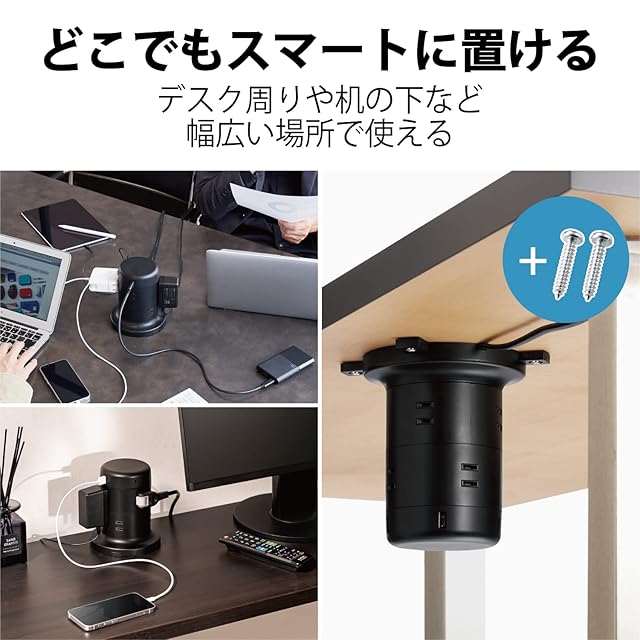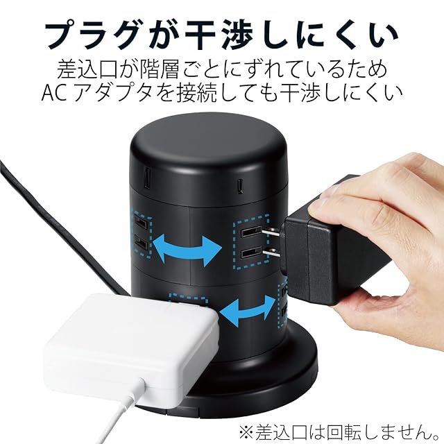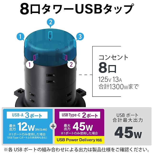 8個の差込口と2個のUSB Type-C(TM)(USB-C(TM))ポート、3個のUSB-Aポートを備えたタワー形状のUSBタップです。USBポートの合計最大出力は45W(5V/9.0A)でACアダプタを利用することなく、対応するスマートフォンやタブレットの充電ができます。また、USB Type-C(TM)(USB-C(TM))ポートの単独使用時はUSB Power Delivery 45Wが利用でき、対応するパソコンなどの充電も可能です。