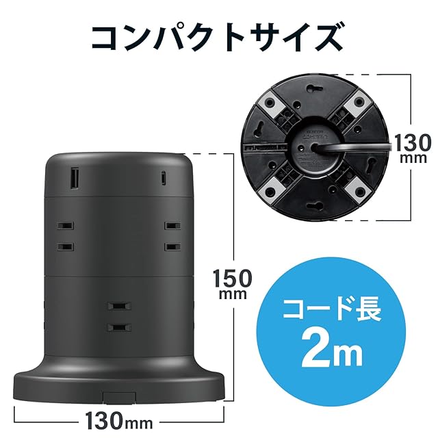 エレコム 電源タップ タワー型 延長コード [ 8個口 & USB-C×2ポート USB×3ポート] USB PD 45W 固定パーツ付 雷ガード ほこりシャッター 2m ブラック ECT-2120BK