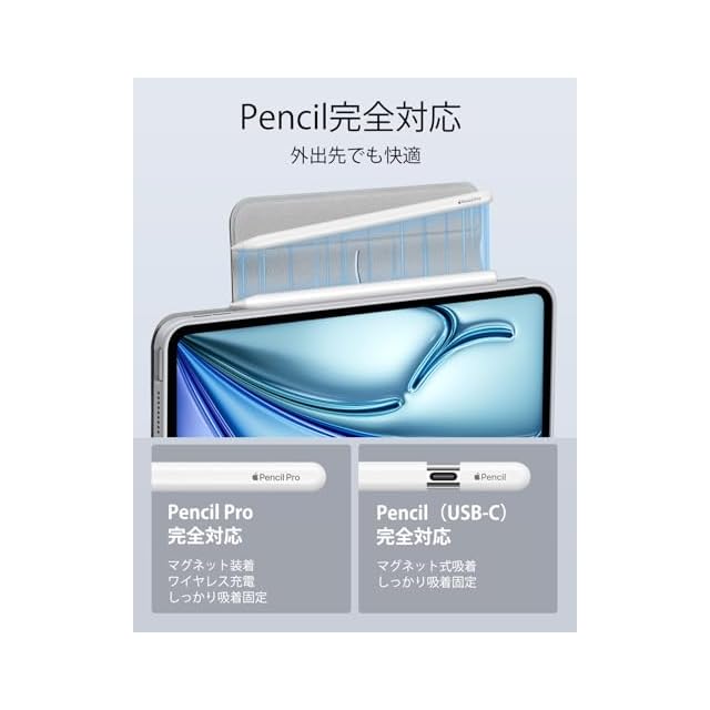 【Pencil Pro&Pencil (USB-C)対応】:Pencil Proへ完全対応かつ、磁気充電用の側面の溝と、Pencilをしっかりと固定するマグネットクラスプを備えています