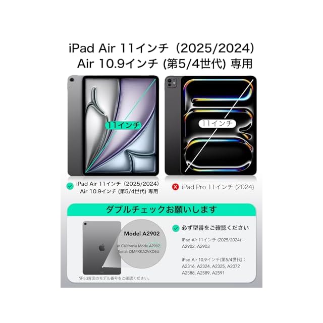 【互換性】:iPad Air 11インチ(2025/2024)、iPad Air 第5/4世代(2022/2020)専用です。モデル:A2902、A2903、A2316、A2324、A2325、A2072、A2588、A2589、A2591,他のiPadモデルと互換性がありません