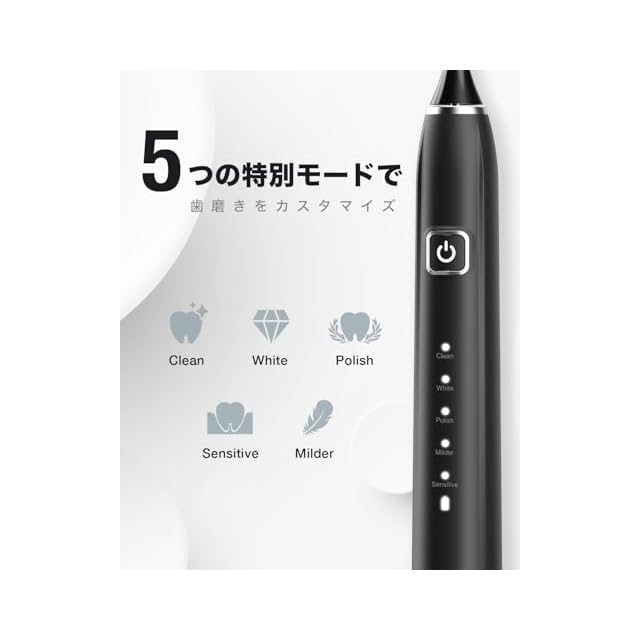 【5つの高性能の電動歯磨きモード】cleanクリーン(やさしい)、whiteホワイト(強い)、polishポリッシュ(強い反転周波数)、milderマイルド(やさしい反転周波数)、sensitiveセンシティブ(ソフト)。各種類の歯や歯ぐきの状態にちゃんと合わせます。お好みや歯科医の勧めに合わせて最適な歯磨きモードを選択することができます。