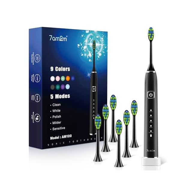 7am2m 電動歯ブラシ 超音波歯ブラシ ソニック 電動はぶらし振動 替えブラシ6本付き ワイヤレス急速充電 一回充電で90日使用可能 5モード 電動歯ブラシ磨き 2分間オートタイマー機能 IPX防水 低騒音 スマート歯磨き ミッドナイトブラック