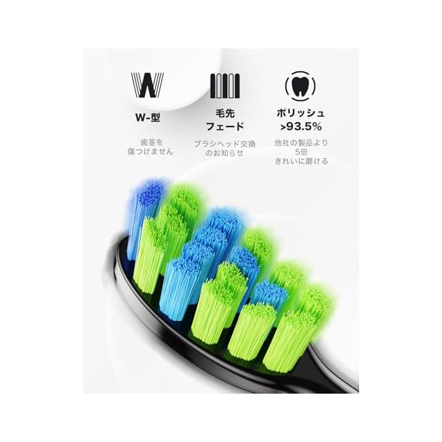 【6つの替えブラシ、「W」デザイン】替えるブラシヘッドを6個付属しているので、頻繁に交換用の電動はぶらしヘッドを注文する必要がありません。 毛先にはDUPONTナイロンを採用し、歯の形に合わせた「W」デザインで、歯ぐきや届きにくい部分を徹底的にクリーニングします。 注意:口腔内をやさしく扱っていただきます。 青いブラシ毛先の色が薄くなったら、ブラシヘッドを交換してください。 1つのブラシヘッドで3ヶ月間使用できて、6つのは約18ヶ月間使用できます。