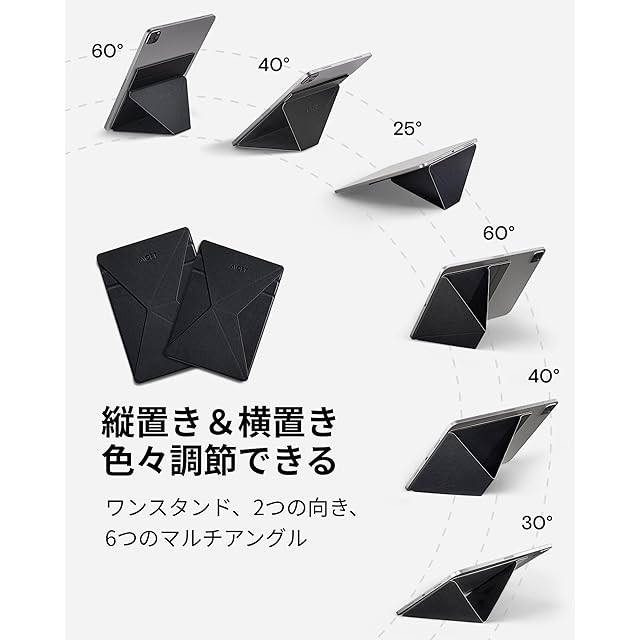 【6つの角度・自分の最適】MOFTタブレットスタンドは、縦置きと横置き、2つの向きで合計6種類のマルチアングル機能を備えているので、場所を問わず、状況や気分に合わせてタブレットをお使いいただけます。文章を書くとき、絵を描くとき、動画を鑑賞するときは横置きモードで、読書や資料チェックなどは縦置きモードに変換!それぞれ自分に合った“心地よい角度・姿勢”を決めましょう!