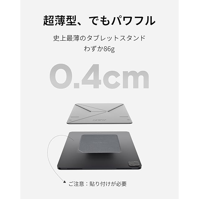 【極薄・超軽量設計】厚さはわずか0.35cmの超薄型設計の上に225gしかいないの重さ、MOFTSnap-Onタブレットスタンドはフラット状に折りたためるので、タブレットに付けっぱなしでも邪魔になりません。また、使わないときは、本棚やスリーブケース、普段使いのカバンに入れておくだけ、使わなければ気付いてもらえないほど薄い存在感。収納スペースや持ち運びの心配は一切不要。一緒に持ち歩けば、オールインワンのポータブルデスク環境が完成です。