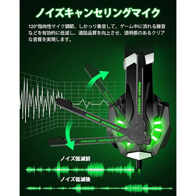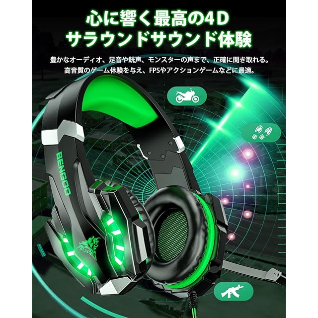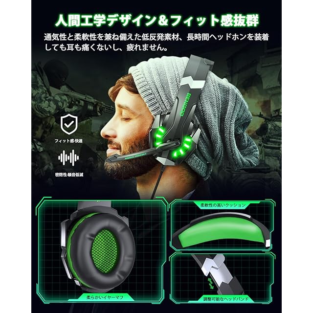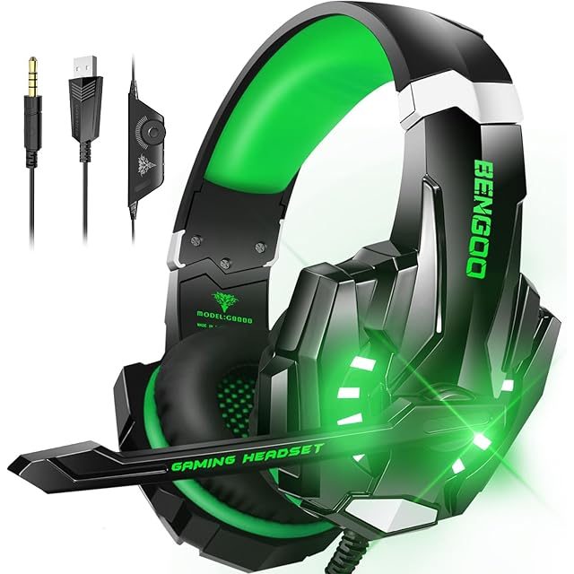 BENGOO ゲーミングヘッドセット PS5 ヘッドセット ノイズキャンセリング マイク付き 3.5mm有線 ゲーミングヘッドホン スイッチ ヘッドフォン 軽量 全効能 重低音 LEDライト コントローラー ミュート付き ステレオ FPS ゲーム用 Nintendo Switch Xbox One PS4 スマホ PC対応 (緑)