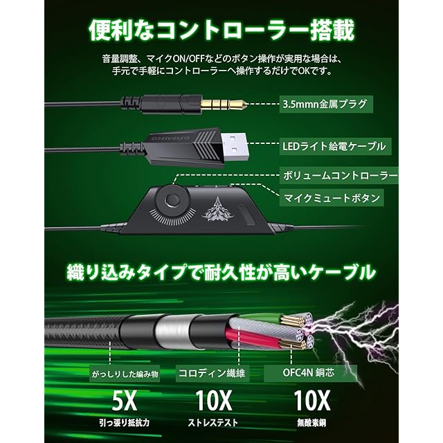 【耐久性と便利性】ワイヤーには10芯OFC無酸素銅線材の耐久性と 強度に優れた伸縮性ケーブルを採用しているため絡まりにくい設計と なっています。ヘッドバンド部分はABSとタングステン網で高い耐久 性を実現しました。調整コントローラーを手元に置けばスピーカーとマ イクの調整が即時に可能です。ご使用状況に合わせて自由自在に変化で きる商品となっております。【安心的な日本語サポート】一年間無料が提供しております。 日本語によるカスタマーサポートが対応しておりますので、万が一、破損や故障、付属品不足等がございましたら、お気軽にご連絡ください。必ず最善を尽くし、カスタマーサービスをご対応いたします。