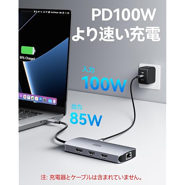 【PD100W急速充電対応usb ハブ type-c&コンパクトサイズ】このUSB C ハブ hdmi 2つは最大供給電力値100WのPDポート付き、ドッキングステーション displayportを使用しながらパソコンに快速充電が可能で、充電切れの心配がありません。USB PD100W対応アダプタを接続すると、パソコン本体へ最大85W給電が可能。★★★【ご注意】:本type-c ハブの消費電力は最大15Wです。そのため100W出力のUSB PDアダプタ接続時はパソコンに対し85Wの給電となります。(理論値)また、このUSB C ハブは高品質なアルミニウム合金素材で作られ、放熱性がよく、耐久性にも抜群です。デスク上で邪魔にならず、持ち運びにも便利なusb-c ハブ displayport