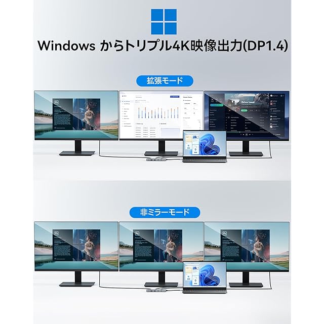 【最大3台のデスプレイに4K高精細映像出力】HDMIポート×2とDisplayPort×1で最大3画面出力可能なUSB Type-Cドッキングステーション 3画面出力。モニターを使って大画面で作業をしたり、USBメモリでデータをやり取りしたりすると、ポートが不足しがちになります。このマルチモニター 3画面ドッキングステーションを使うことで、モニターを増やしたり、周辺機器をよりパワフルに使えたりするようになります。★★★【ご注意】:①、4K/60Hzを利用するには、PCがDPort 1.4 Alt Modeに対応必要。②、PCはIntel第10世代以前のプロセッサーの場合は、2つのディスプレイを拡張しかできません。③、MAC接続時のご注意:この製品はMACの外部モニター2台以上の拡張モードをサポートしていません